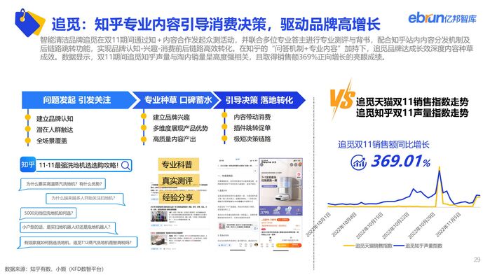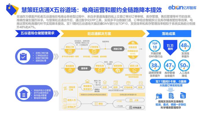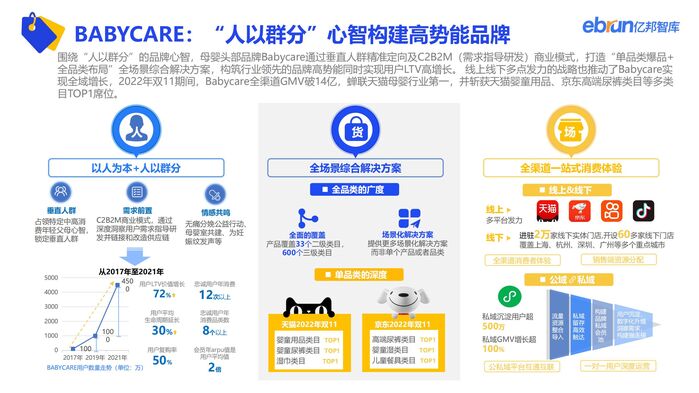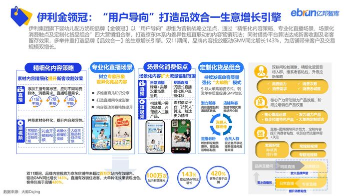 公私域联动成为主流,以商家小程序为节点的去中心化的交易生态正在形成。国货在今年双11延续高景气态势,以BAYBCARE、伊利金领冠、追觅为代表的型品牌通过在营销、产品、渠道运营上差异化布局形成消费者心智强占领,阐述品牌“长坡厚雪”之道。直播机构在本届双11呈多元化、矩阵化、升维化运营特征,以慧策旺店通为代表的企服SaaS价值正从通用工具向数据智能演进。