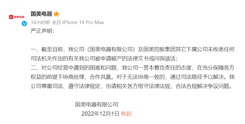 国美电器回应已被破产清算
