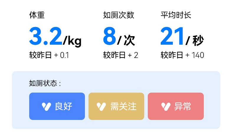 智能化还能实现的另一大好处是——通过联网的数据监测,实时观察宠物的健康指数。CATLINK的APP可以自动采集猫咪的基础生理数据,譬如体重、饮食习惯等,监测宠物的健康状态,包括如厕次数和如厕平均时长等指标,生成定制化的“健康报告”,以更早地预警毛孩子的生理隐疾。