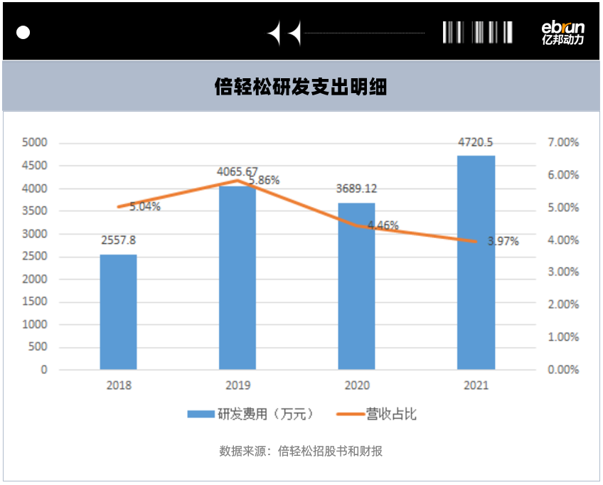 2018到2021年,倍轻松研发费用分别约为2557.8万元、4065.67万元、3689.12万元、4720.5万元,占当期营收的比例分别为5.04%、5.86%、4.46%、3.97%。2022年上半年,倍轻松研发费用达3031.05万元,同比增长38.77%。