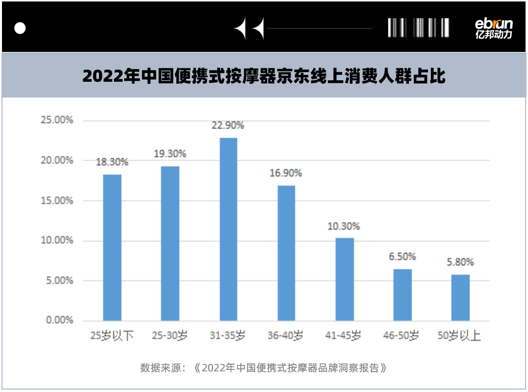 弗若斯特沙利文发布的《2022年中国便携式按摩器品牌洞察报告》显示,2022年京东线上平台便携式按摩器的消费群体年龄段主要集中在35岁及以下,其中31到35岁消费人群占比最高达到22.9%,25岁到30岁人群排第二达到19.3%。