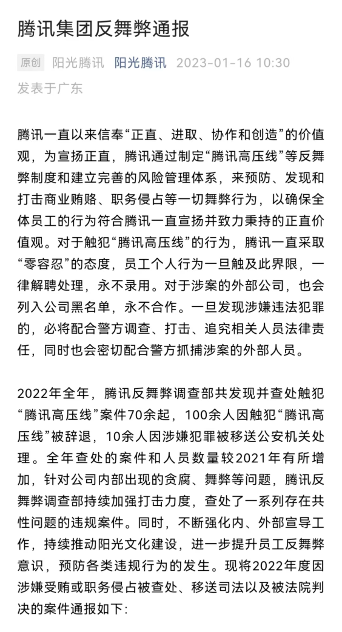 1月16日,根据“阳光腾讯”公众号发布,2022年全年,腾讯反舞弊调查部共发现并查处触犯“腾讯高压线”案件70余起,100余人因触犯“腾讯高压线”被辞退,10余人因涉嫌犯罪被移送公安机关处理,推文中通报了18起案件,以及23家2022年新增永不合作企业。