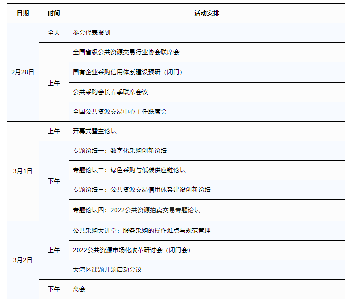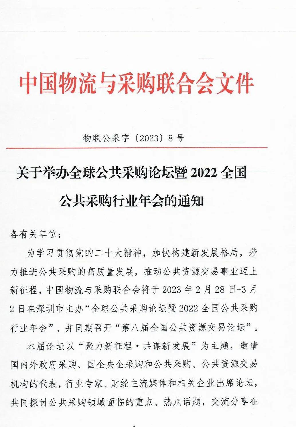 为学习贯彻党的二十大精神,加快构建新发展格局,着力推进公共采购的高质量发展,推动公共资源交易事业迈上新征程,中国物流与采购联合会将于2023年2月28日-3月2日在深圳市主办“全球公共采购论坛暨2022全国公共采购行业年会”,并同期召开“第八届全国公共资源交易论坛”。