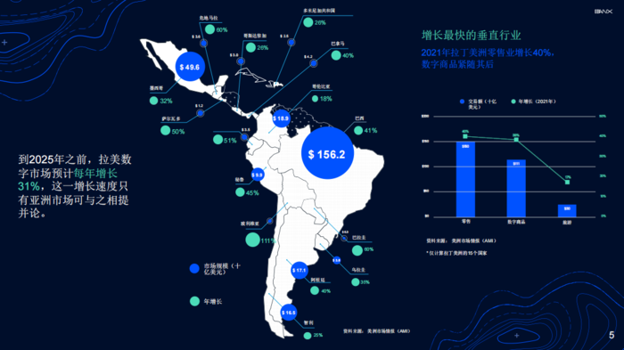对于那些想要拓展全球版图的企业来说,拉丁美洲可能是下一个前沿阵地,这里有广阔的扩张和增长机会。 该地区数字市场的年增速接近30%。 AMI的数据显示,在过去的两年里,拉美新增1.5亿网购用户。