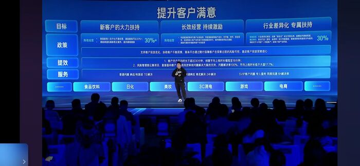 根据行业差异化制定客户服务方案;品牌“超品日”设立对投比例,配赠站内海量资源;增量预算提供最高30%返货;对于VIP客户(年框客户)配给大量产品权益。