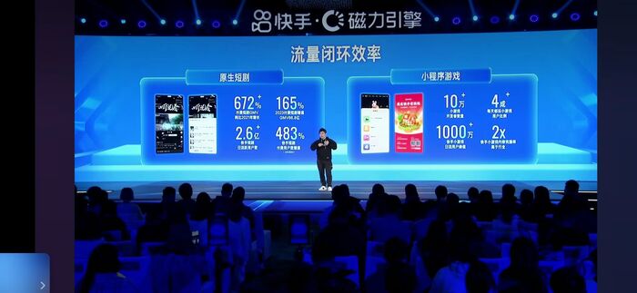 在提升“流量闭环效率”环节,快手磁力引擎将发挥平台原生短剧、小程序游戏等站内流量资源优势。平台数据显示,2022年,快手付费短视频GMV同比2021年增长672%,快手短剧日活跃用户数超2.6亿;2022年4月至今,快手短剧付费用户数增速超483%。