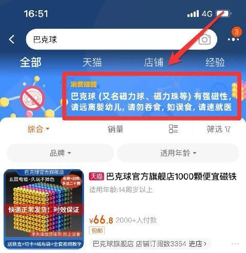 目前,在淘宝上搜索巴克球”、“磁力珠”,会跳出“巴克球有强磁性,请远离婴幼儿,请勿吞食,如误食,请速就医”的醒目警示语,这也在一定程度上减少了儿童误食磁力球的机率。