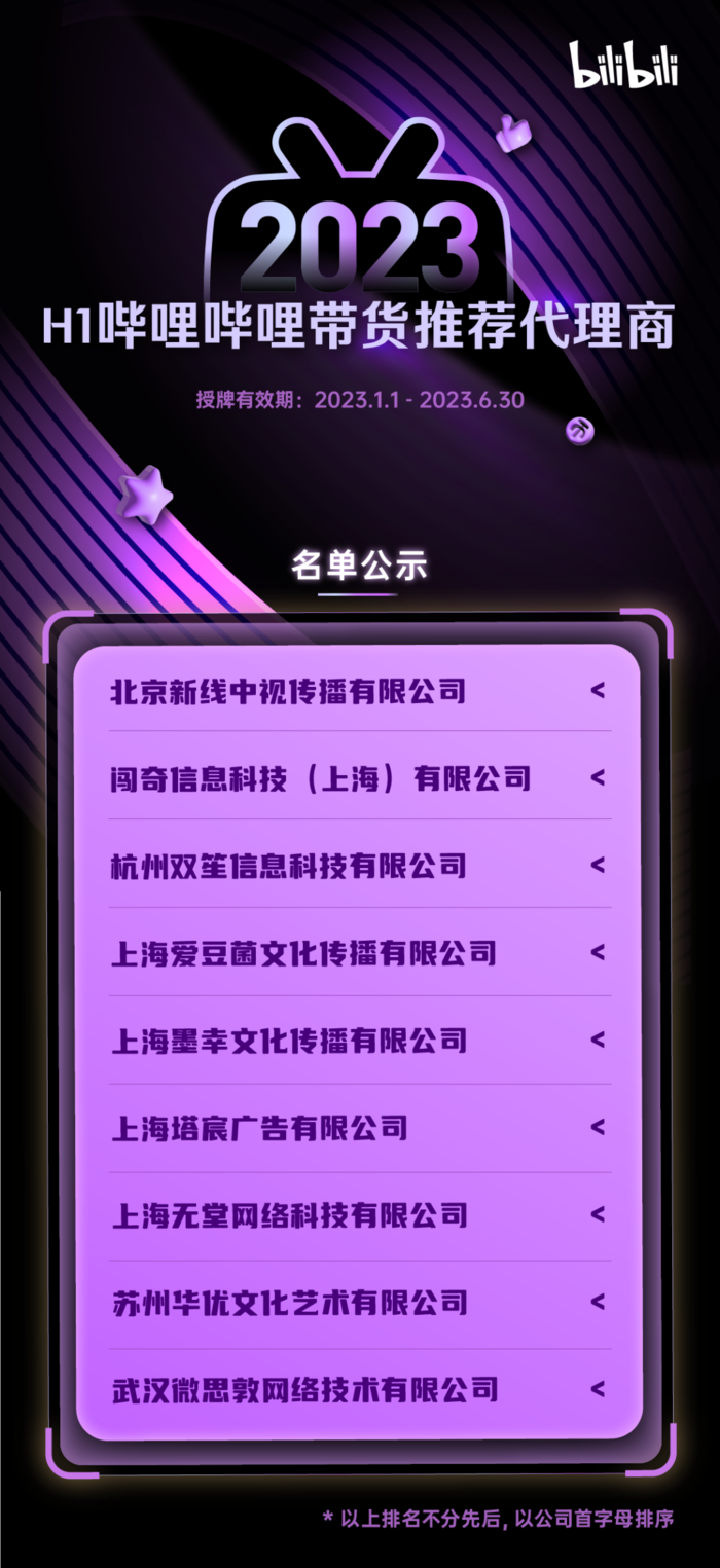 【亿邦原创】近日,B站公布“2023年初哔哩哔哩优质代理商名单”,并首次公布了“带货推荐代理商”。这也是B站首次推荐有效期为半年或一年的“优质代理商”名单。