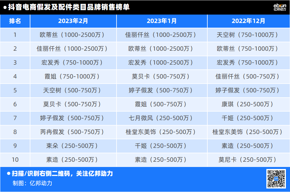 和国际市场情况一样,国内假发市场的集中度同样不高。飞瓜数据显示,最近三个月内,抖音电商假发及配件类目品牌销售榜单TOP10中,40%为新面孔品牌,且TOP1的约销售额仅为1000万元左右。