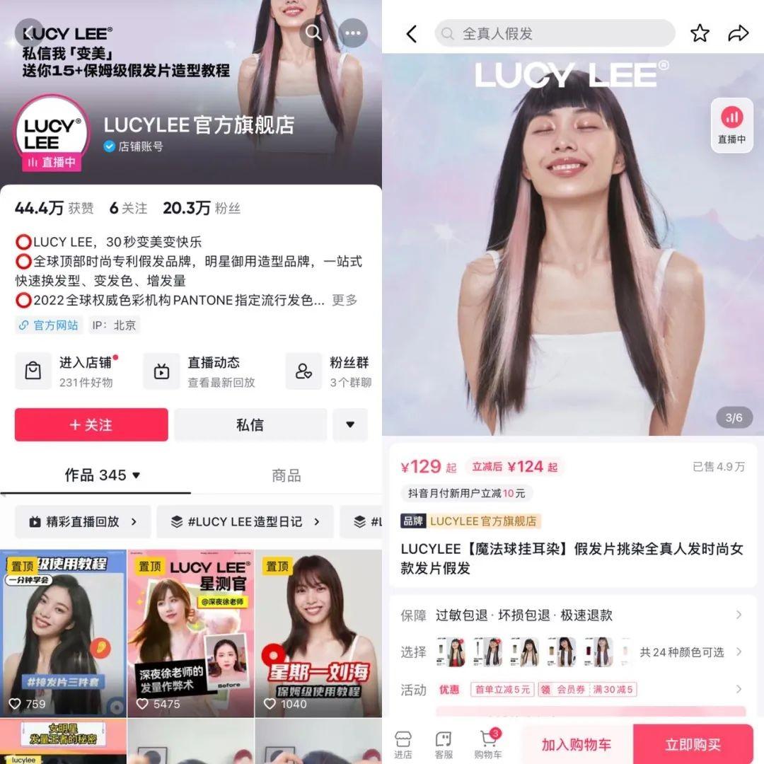 其中,LUCYLEE是抖音电商头部假发品牌商,由娱乐圈“发量王者”鞠婧祎代言,主打明星同款、高性价比、有趣潮流等卖点,消费者可以一站式快速换发型、变发色、增发量。