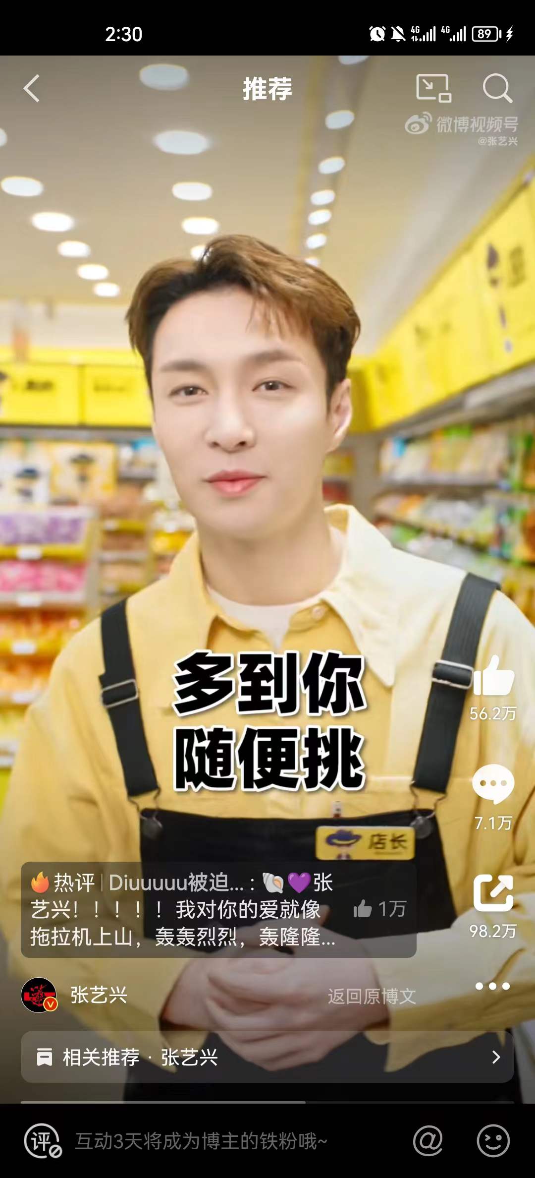 【亿邦原创】亿邦获悉,4月7日中午,线下零食集合店品牌——零食很忙正式通过官微宣布,张艺兴担任品牌全新代言人。目前在零食很忙官微、公众号、视频号等发布的视频中均可看到,张艺兴身穿黄色服装,带广大粉丝、消费者群体“逛店和嗨吃零食”。