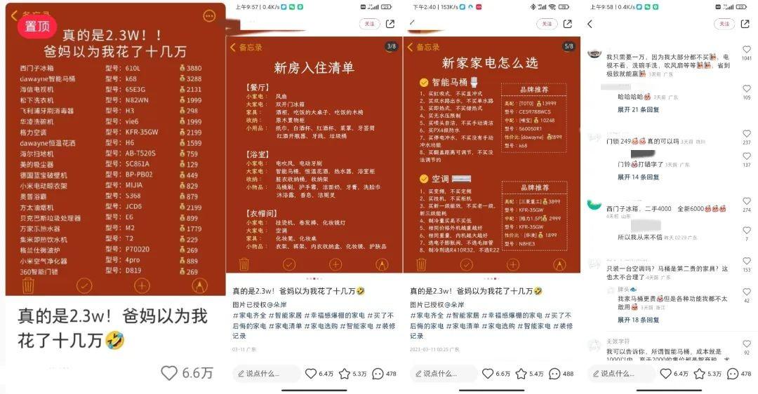 小红书爆文内容:博主分别从家装的各个反面进行安利,也算是很用心良苦了,对于价格和品类也是一一标注了,对于有需要的人确实有参考的建议。