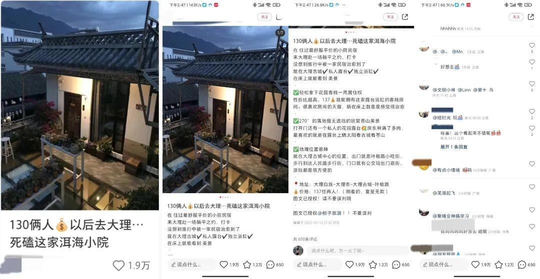 小红书爆文内容:博主除了分享这家小院的别致之处的同时也把这家小院的特点展现的淋漓尽致,其次抛出价格吸引客户的注意,对于质量好,景色没,还性价比高的酒店,对于旅游人来说还是很难被拒绝的。