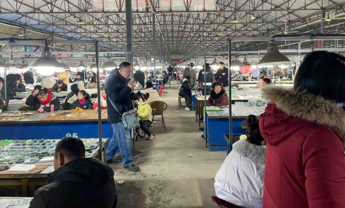 石佛寺人几乎生活在玉石批发市场里。有限的地理空间,被大大小小十多个玉石批发市场完全占满。当地人将这些批发市场分为四个类型,早早市、早市、上午市场和下午市场。其中早早市销售原石和板材,前些年货源充足时,新鲜的原料成为抢手货,谁赶在头排报上价才有机会拿到。神奇的是这样的交易也不是公开加价拍卖,而是靠着一种暗语现场一对一沟通。现在原材料供应被拉平,抢报价的必要性已经降低。