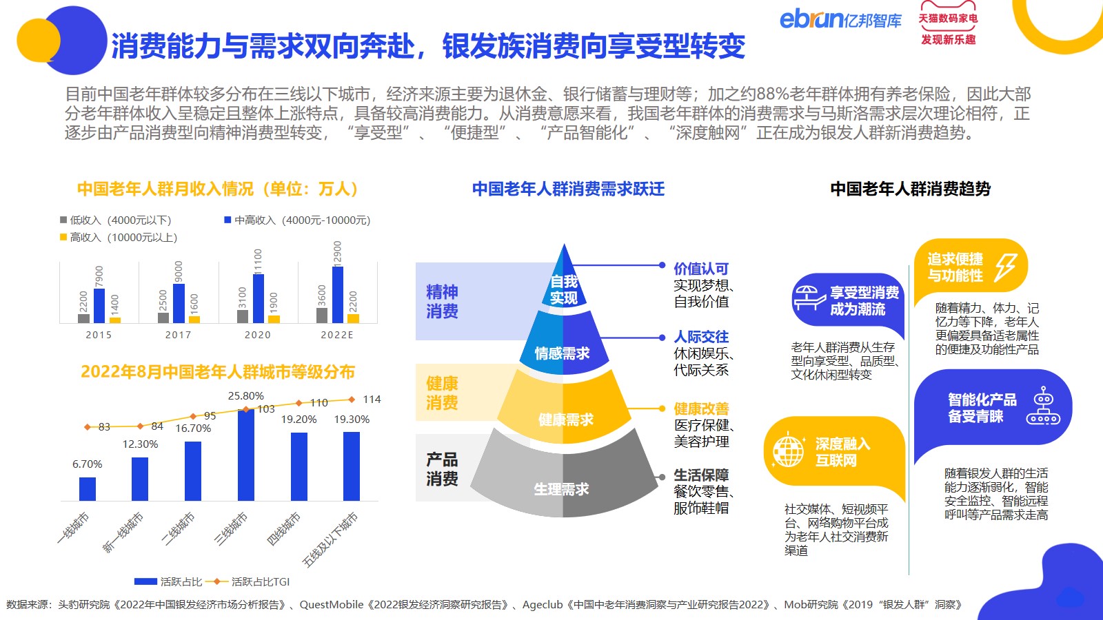 目前中国老年群体较多分布在三线以下城市,经济来源主要为退休金、银行储蓄与理财等;加之约88%老年群体拥有养老保险,因此大部分老年群体收入呈稳定且整体上涨特点,具备较高消费能力。从消费意愿来看,我国老年群体的消费需求与马斯洛需求层次理论相符,正逐步由产品消费型向精神消费型转变,“享受型”、“便捷型”、“产品智能化”、“深度触网”正在成为银发人群新消费趋势。
