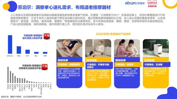 苏泊尔:通过洞察按摩保健器材在父母、老人送礼场景的重度渗透率,以及消费者对”舒适度、实用性”等维度高关注度需求后,发力布局全身按摩品类,产品以舒适指数高、制热效果强、操作简便方便上手,简约的外观对标老年人群体。