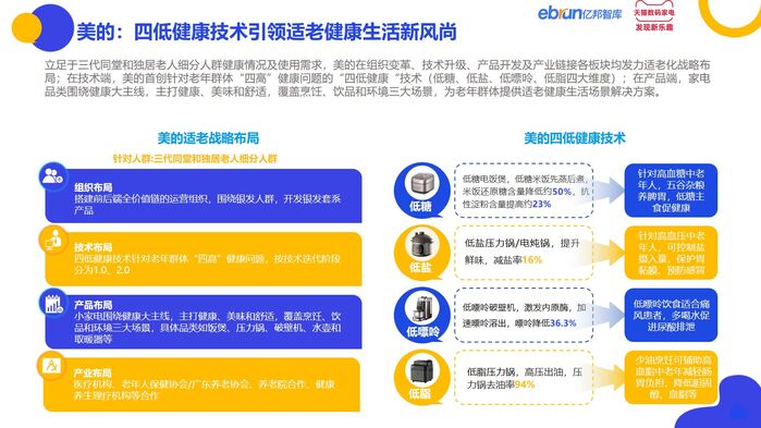 美的:在组织变革、技术升级、产品开发及产业链接各板块均发力适老化战略布局,首创四低健康技术,为老年群体提供适老健康生活场景解决方案。