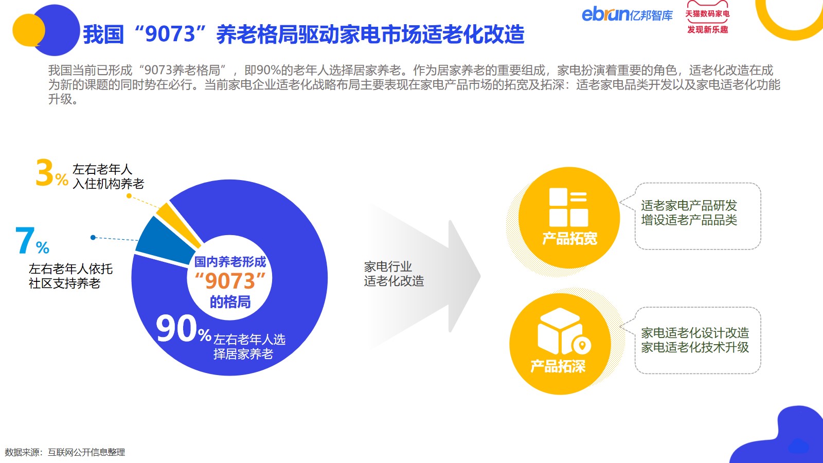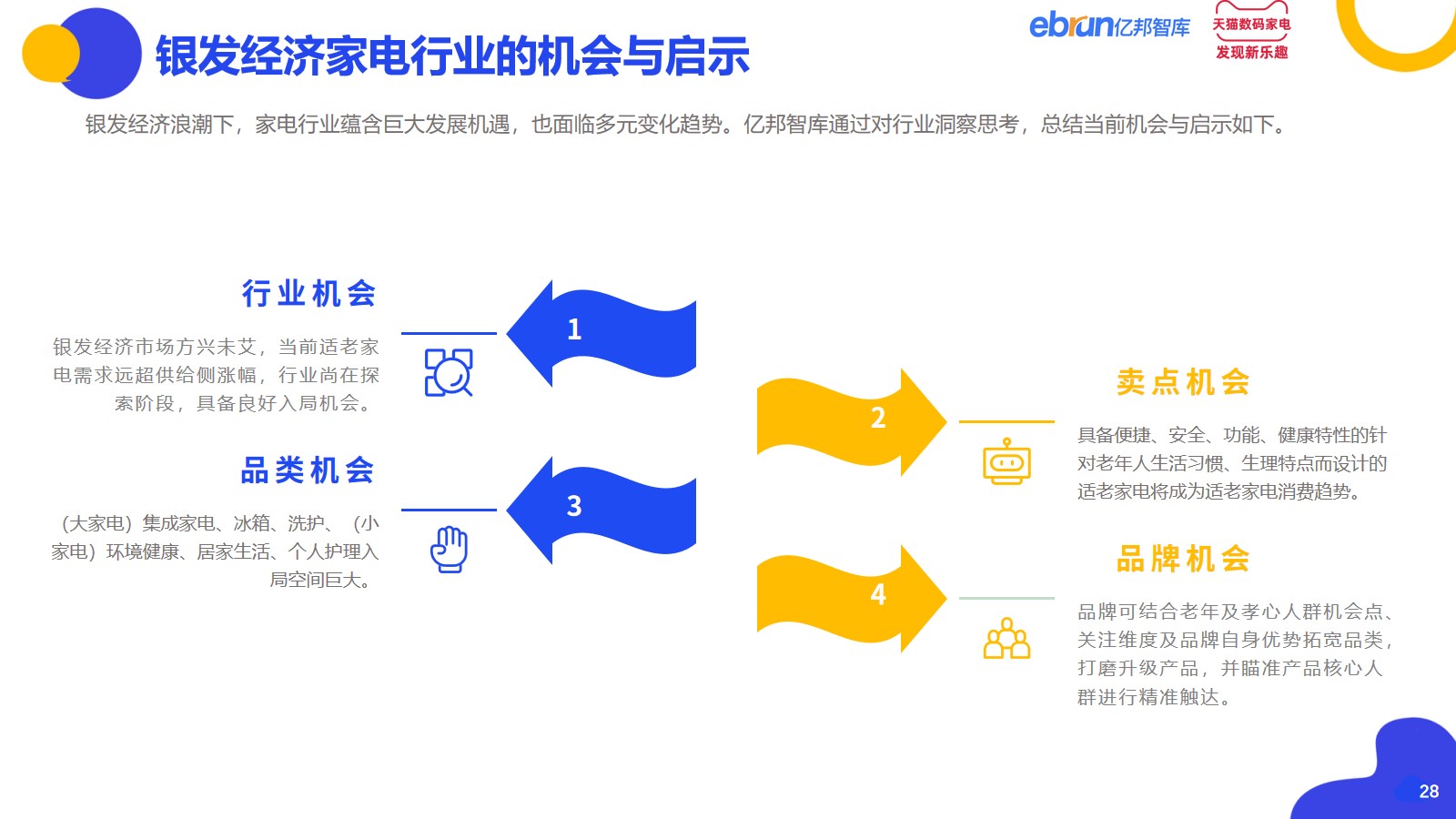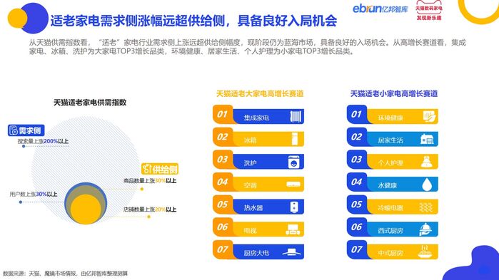 银发经济浪潮下,家电行业蕴含巨大发展机遇,也面临多元变化趋势。亿邦智库通过对行业洞察思考,总结当前机会与启示如下:
