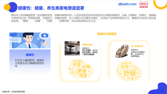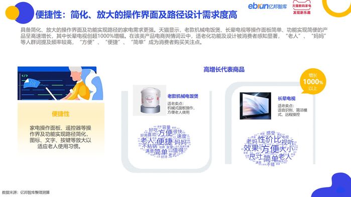 卖点机会:具备便捷、安全、功能、健康特性的针对老年人生活习惯、生理特点而设计的适老家电将成为适老家电消费趋势。