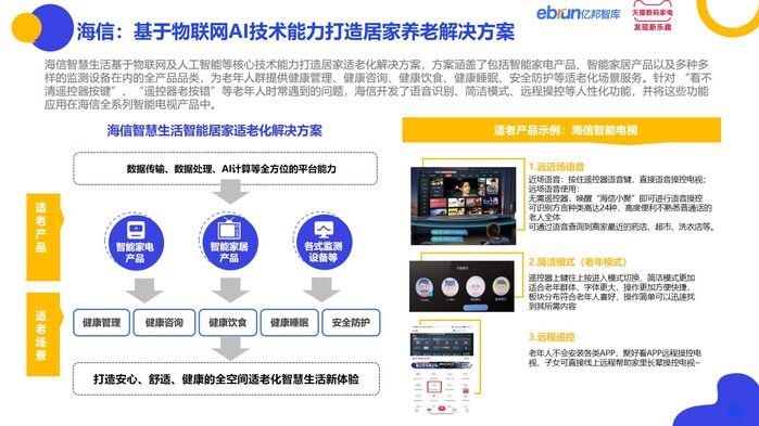 海信:基于物联网AI技术能力打造居家养老解决方案,针对 “看不清遥控器按键”、“遥控器老按错”等老年人时常遇到的问题,海信开发了语音识别、简洁模式、远程操控等人性化功能,并将这些功能应用在海信全系列智能电视产品中。