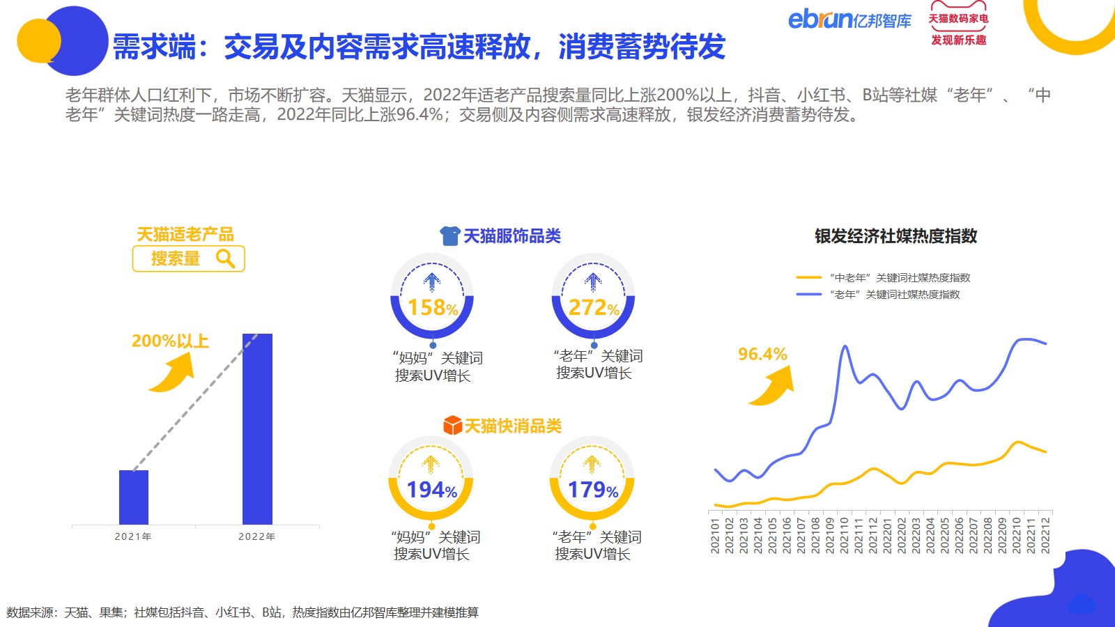 随着老龄化程度不断加深,政府端、需求端、供给端都在积极探索应对,为银发经济市场注入要素及活力。政策端,国家通过开展多项老龄化项目进入市场,丰富银发经济产业链,引导、扶持和规范银发经济发展。在需求端,交易侧及内容侧指数爆发式增长;供应端,大批老年相关企业涌现入局,天猫相关店铺、商品数量迎来高景气增长。多方合力驱动下,万亿银发经济市场欣欣向荣,消费蓄势待发。