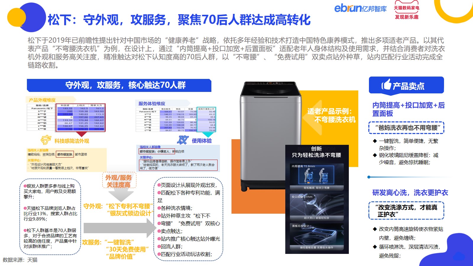 松下:结合消费者对洗衣机外观和服务高关注度,精准触达对松下认知度高的70后人群,以“不弯腰”、“免费试用”双卖点站外种草,站内匹配行业活动完成全链路收割。
