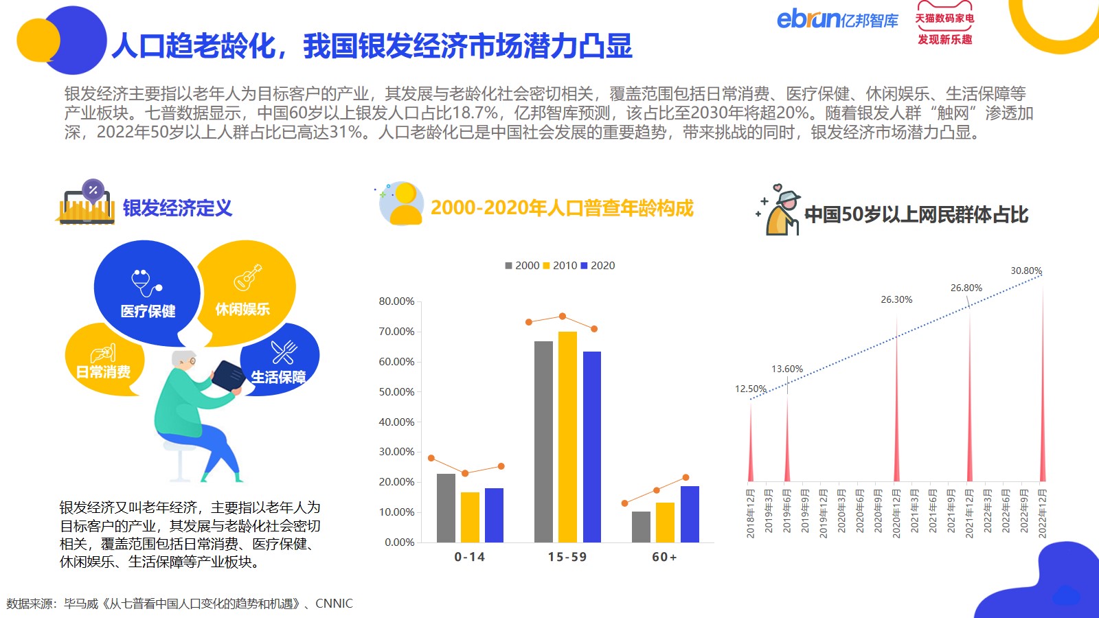 2020年,我国七普数据显示, 60岁以上人口已达2.6亿人,占全国18.7%,相比2010年上升了5.44个百分点,呈规模大、增长快特征。与此同时,随着银发人群“触网”渗透加深,2022年50岁以上人群占比已高达31%。人口老龄化已是中国社会发展的重要趋势,带来挑战的同时,银发经济市场已然崛起,蕴含巨大市场机遇。基于此背景,亿邦智库联合天猫家电发布《与老同行—2023银发人群消费趋势洞察报告(家用电器篇)》,立足于银发经济市场机遇与趋势洞察,力求当下为每一个已经进场或即将进场的玩家提供坐标及方向,为行业发展预判提供视角及参考。