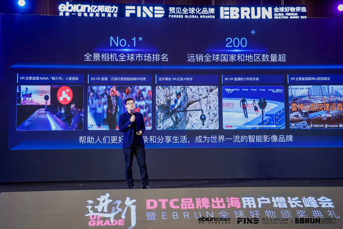 【亿邦原创】4月20日消息,在亿邦动力(第三届)DTC品牌出海用户增长峰会暨EBRUN全球好物颁奖典礼上,影石Insta360市场总监袁跃发表了题为《技术为圆心,用户场景为驱动,从小众市场闯出全球化品牌》的演讲。据袁跃的介绍,成立于2015年的影石Insta360在不到8年的时间里,即从一家初创全景相机企业,发展成为了全景相机赛道上市占率超过40%的龙头企业,如今产品远销200多个国家和地区,硬件用户数量超过200万。