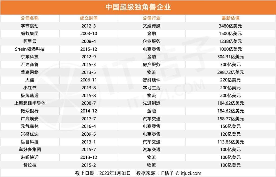 从各估值区间的数量分布来看,值得关注的是,美国估值超过百亿美元的超级独角兽有 35 家,而中国共有 19 家企业,其中,估值在千亿美元以上的企业中国却有 4 家独角兽,美国则仅有 1 家。以下是中美超级独角兽企业列表: