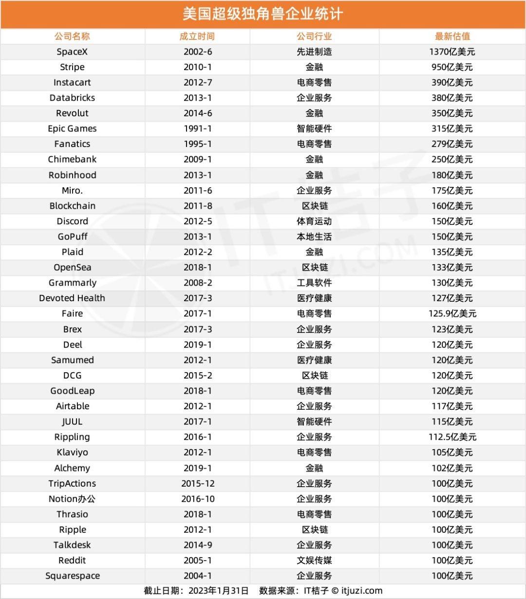 相较于中国而言,美国超级独角兽中行业分布相对丰富,如区块链、工具软件、体育运动等领域都产生了估值超百亿美元的独角兽企业,且集中度也更高,如近 30% 的企业来自于企业服务。不同于中国已拥有 4 家独角兽估值突破千亿美元,美国现有的千亿美元级别的独角兽仅有 SpaceX 一家,余下超级独角兽企业估值大多数在 100-200 亿美元区间浮动。