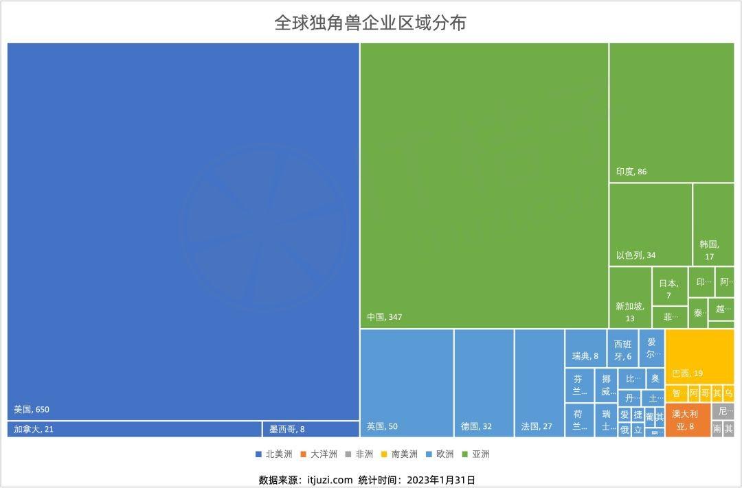 在全球独角兽的分布中,美国独角兽企业有 650 家,位居全球第一,中国紧随其后,有 347 家独角兽企业。中美当前合计 997 家独角兽,占全球独角兽企业总数的 71%。
