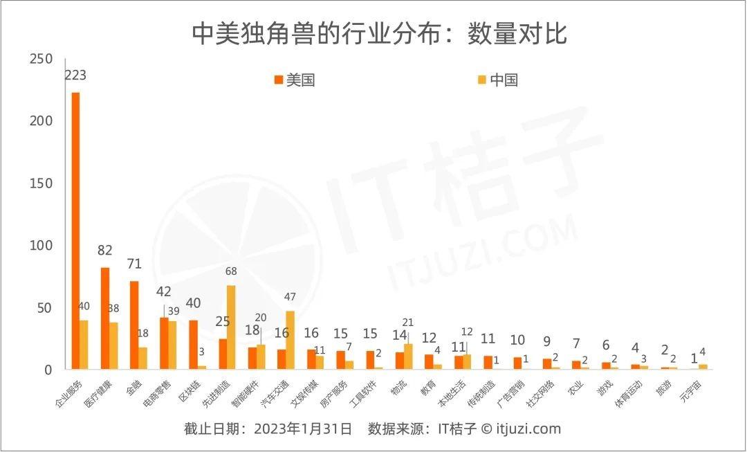 从各行业的独角兽数量来看,中国独角兽企业主要集中在先进制造领域,共 68 家,占总体数量近 20%;而美国拥有独角兽企业最多的行业是企业服务,有近 35% 的独角兽企业来自企业服务领域。