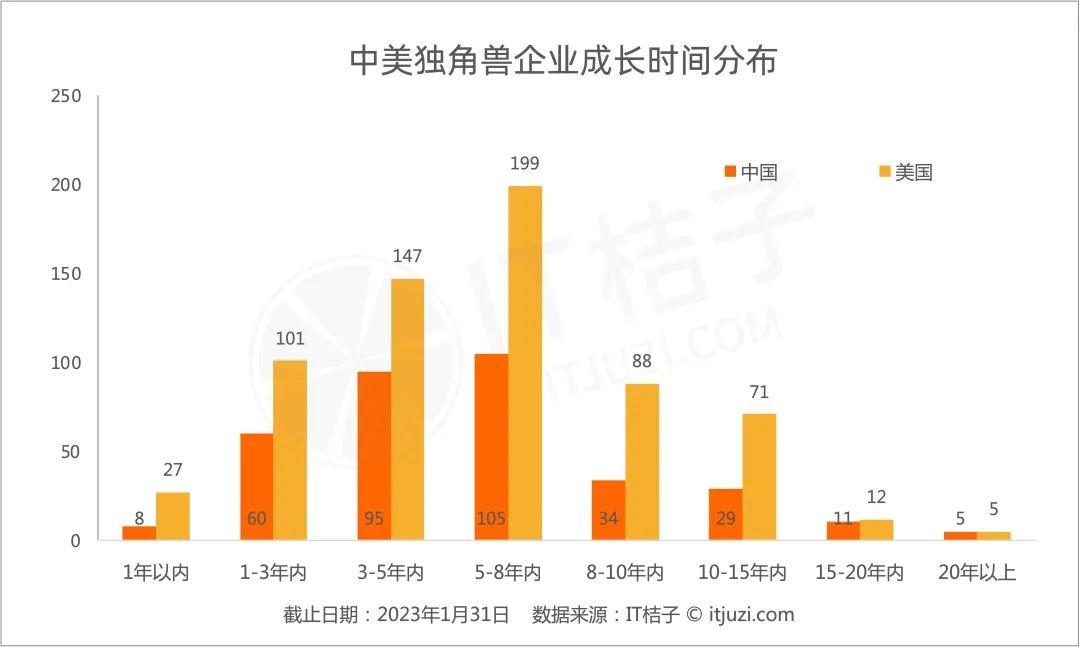IT 桔子统计发现,无论中国还是美国,一个企业成长为独角兽的时间均呈正态分布,即在 5-8 年以内成长为独角兽的企业数量最多,而成立 1 年就成为独角兽企业也相对较少,极少数企业需要花费 20 年以上的时间才能成长为独角兽。