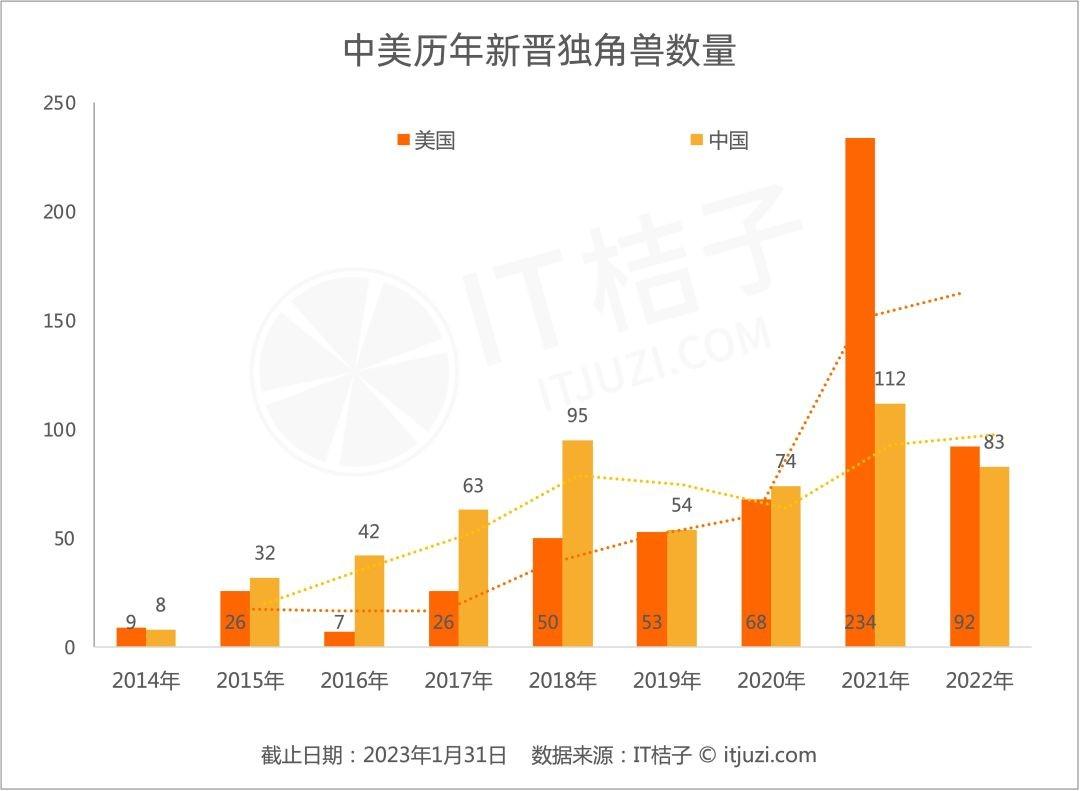 根据 IT 桔子数据,2014-2022 年中美历年新增的独角兽企业数量变化如图所示: