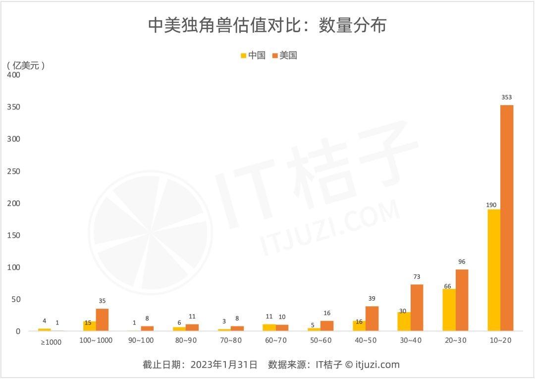 截止到 2023 年 1 月底,中美共 997 家独角兽,估值总额超 3 万亿美元。根据 IT 桔子数据,我们将独角兽按照不同估值区间进行分类,如 10-20 亿美元、20-30 亿美元等,并总结中美独角兽在各估值区间占总体的百分比,以及对比分析各估值区间下独角兽的数量等。