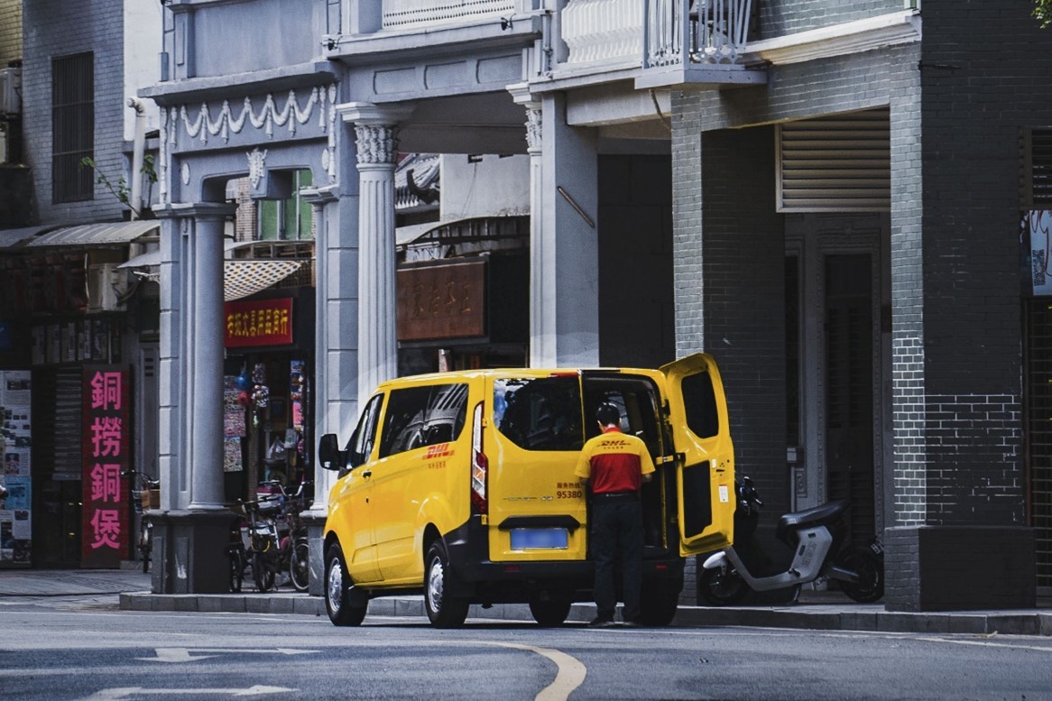 DHL快递派送车在广州市内派件