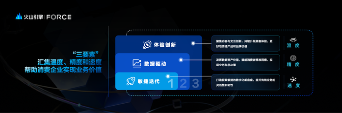 火山引擎消费云把计算浓度拆解成温度、精度和速度三个指标进行衡量:温度可以理解为体验,也是对消费者的体验和关怀;精度则是指数据可以更精确的驱动业务发展和决策。此外,还要有足够敏捷的速度,确保跟上外部变化。
