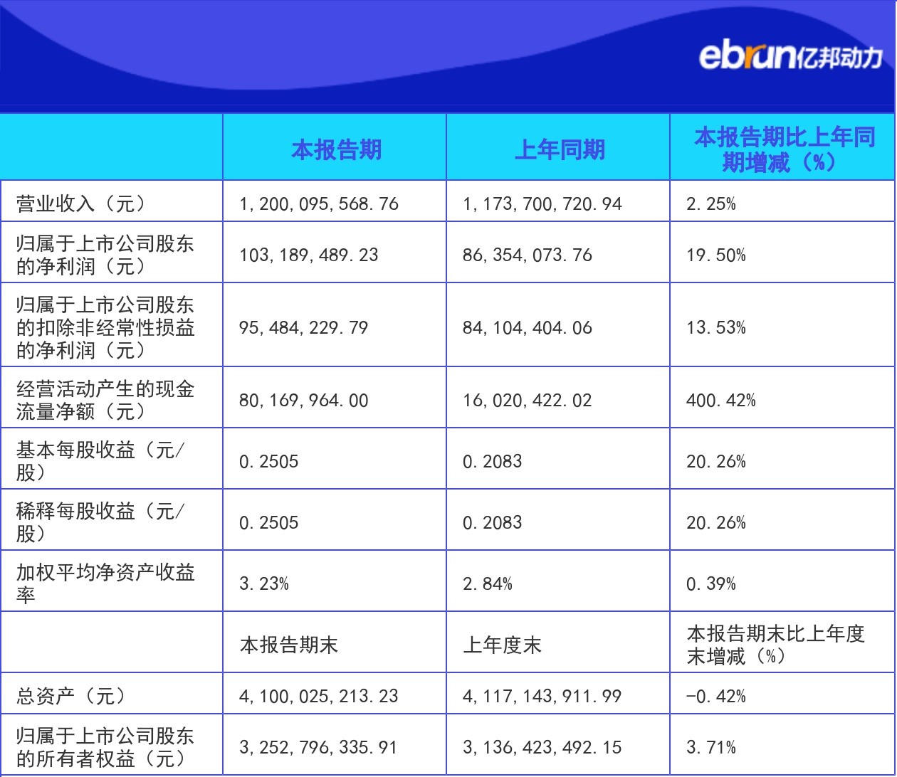 | 归属于上市公司股东的净利润(元) | 103,189,489.23 | 86,354,073.76 | 19.50% |