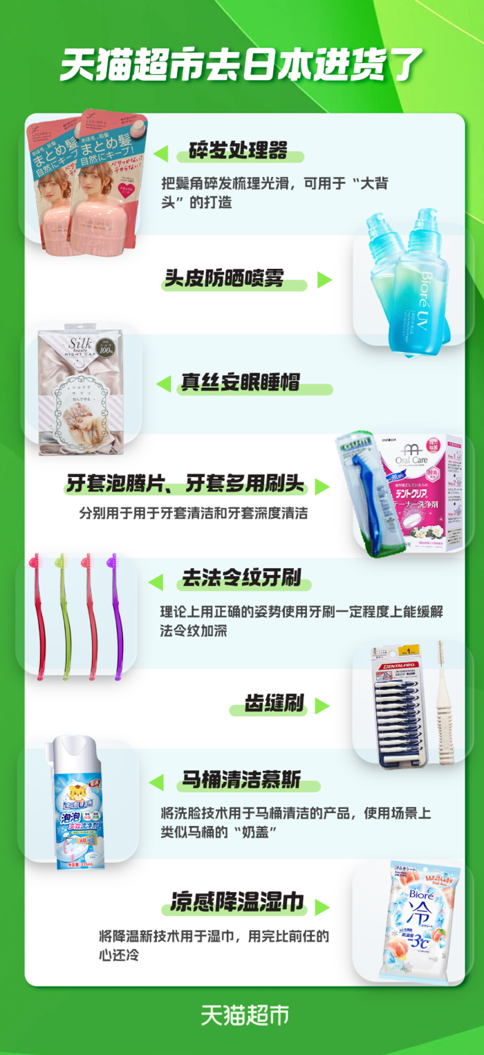 徐振月介绍,这类需求国内消费者不是没有,只是产品的丰富度和需求没法匹配,“我们就是去日本‘进货’的,回来之后用最快的流程赶在618前上新了一大批,还有一些会在7、8月陆续上线。”据了解,淘宝天猫618期间,消费者上天猫超市就能一站式买齐这些新品,最快半天就能送货上门。