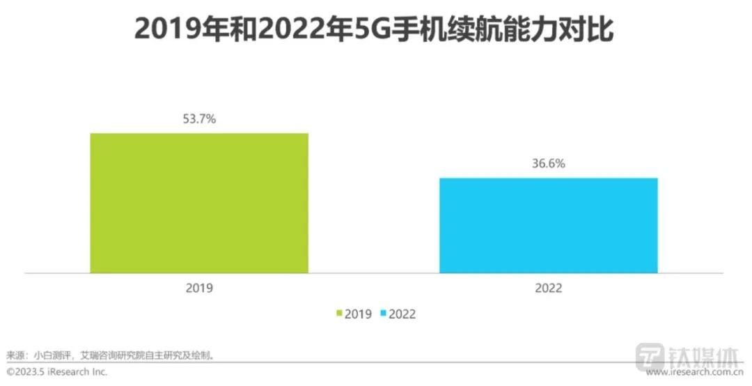 来自艾瑞咨询的数据显示,2022年5G手机电池平均容量为4768毫安,相较2019年提升7.4%。但是,随着人们对手机依赖程度的不断加深,手机应用程序的增多、硬件配置升级等诸多因素影响。2022年5G手机的续航能力相较2019年反而有所下降,智能手机充电需求仍呈现上升趋势。
