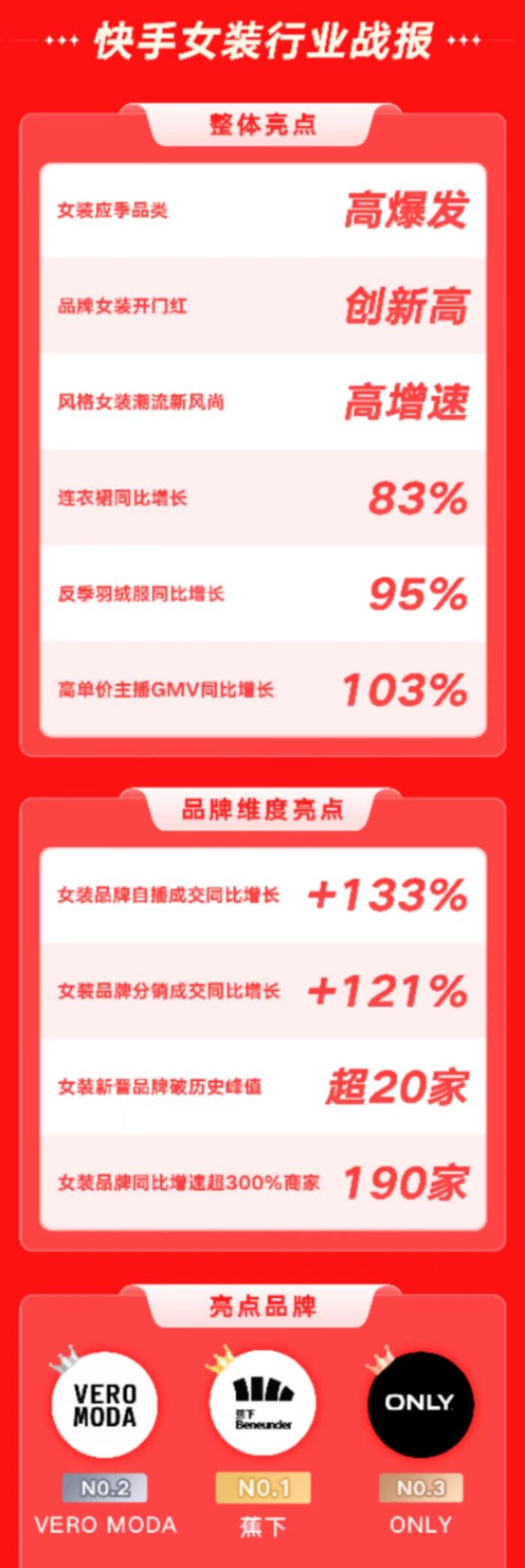 品牌方面,女装品牌自播成交同比增长133%,女装品牌分销成交同比增长121%,女装新晋品牌破历史峰值超20家,女装品牌同比增速超300%的商家达190家。