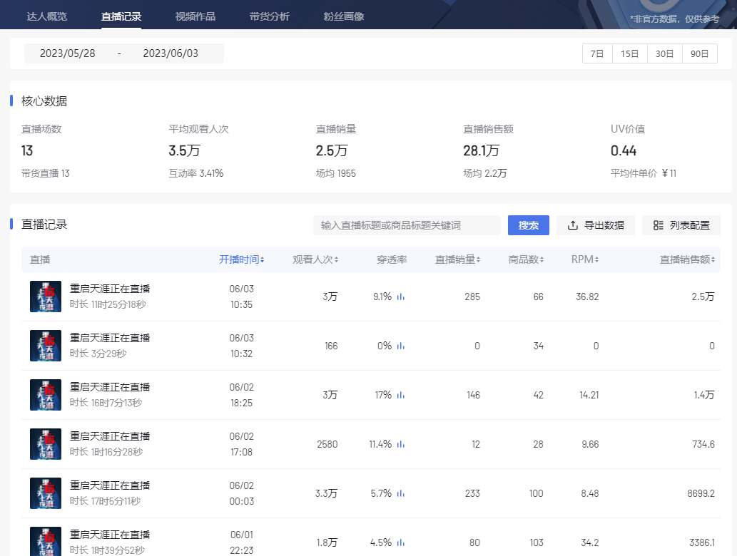 据考古加数据显示,5月28日至6月3日,直播间GMV仅28.1万。