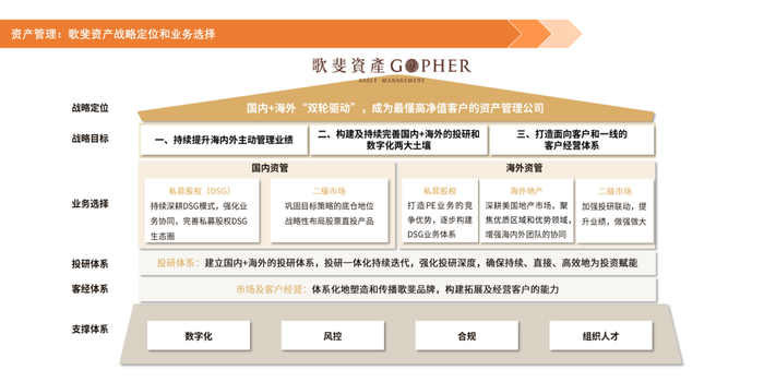 歌斐资产成立于2010年,从国内的私募股权母基金业务开始,目前已经在国内外形成了聚焦私募股权、二级市场以及海外地产业务的战略构架。同时在投研体系、客户经营体系和数字化体系方面不断强化投入,为持续提升海内外主动管理投资业绩打造土壤建设。