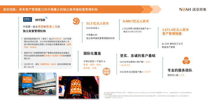 诺亚控股成立于2005年,致力于为中国高净值客户提供财富管理和资产管理服务。在过去18年里,我们累计为客户配置了接近9500亿元人民币的金融资产,截至2022年,资产管理存量规模接近1580亿元人民币。除了在中国大陆75个城市以外,我们还在香港、纽约、硅谷、新加坡、台湾开设了分支机构。