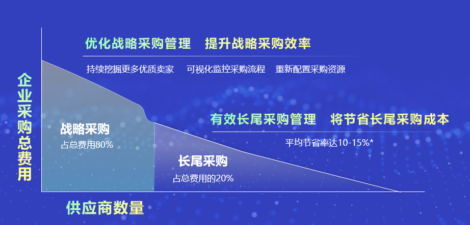 那么,如果从商业采购的组成来看,商业采购可分为战略性采购和长尾采购。战略采购通常占企业采购总支出的80%。它们和原材料、生产工具相关,供应商相对较少,对价格也很敏感,因为它会直接影响企业的生产和核心成本,线上交易比例还不高。例如,无锡有大量的工业中间件,这些都属于战略采购的范畴。
