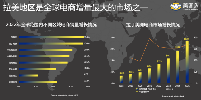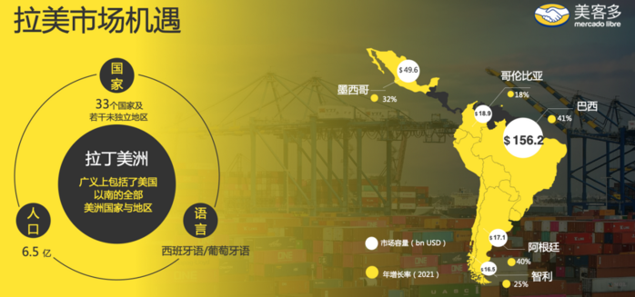 1.市场潜力巨大:拉美人口6.5亿,互联网覆盖率仅56%,线上零售份额4.9%,远低于中国45.3%,电商年增速20.4%,预计2025年容量达8290亿美金。