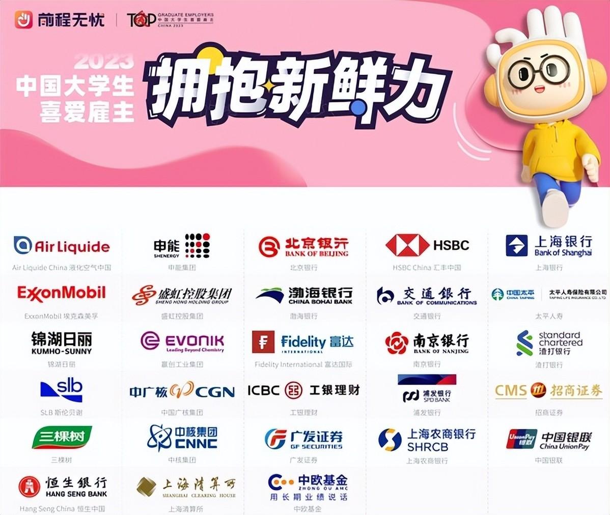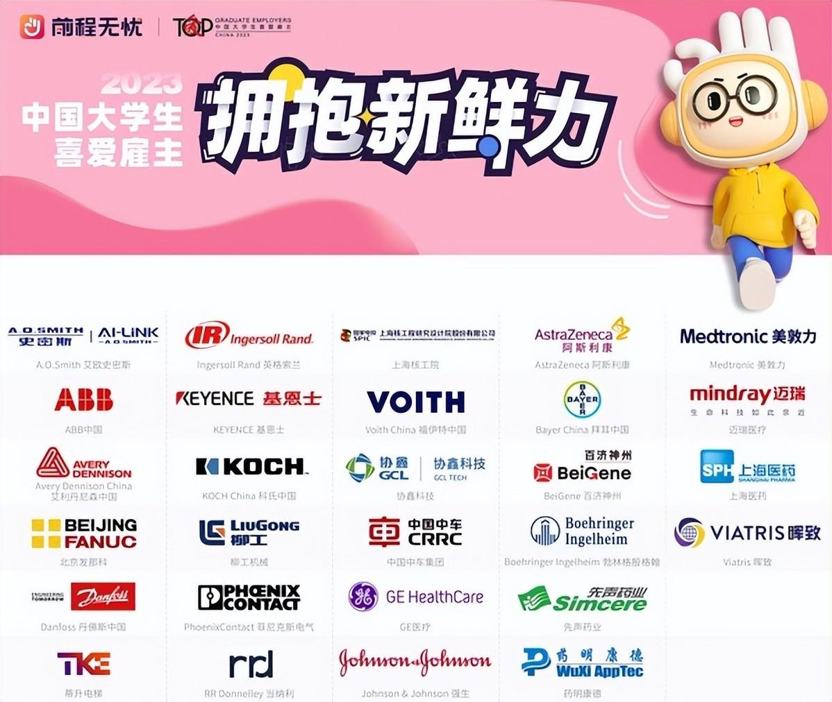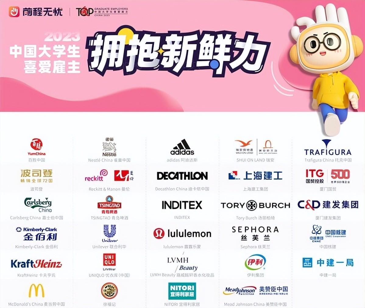 中国大学生喜爱雇主由中国知名的人力资源服务商前程无忧发起,评选深受校园学子赞赏的最佳雇主。它们多年有计划、持续地招聘中国高校毕业生,在校园开展各种活动和科研项目,帮助和扶持大学生自发的公益活动和创业,它们不仅以吸引优秀学子为目标,也热心帮助中国大学生提升知识技能和全球视野,在学生中有广泛的认知和较高的美誉度。