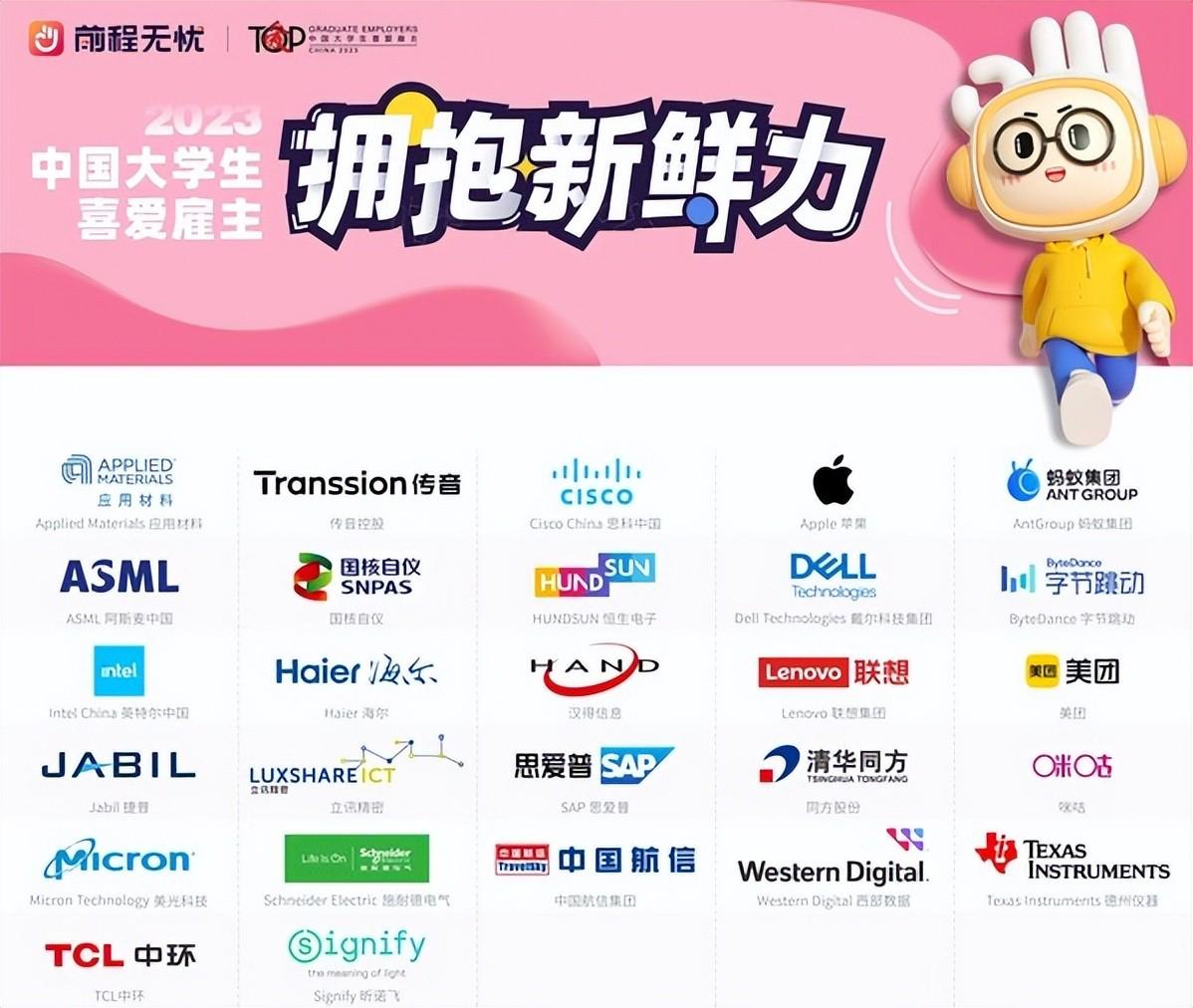 中国权威的人力资源服务商前程无忧今天发布2023年中国大学生喜爱雇主榜单,140家雇主榜上有名,其中95家雇主蝉联这一荣誉, 这是该评选六年来变化最大的一届。140家上榜雇主招聘2022届毕业生10.9万人,其中生产型企业占到了76%,比2022年上升了七个百分点。由于企业们正经历数字化转型、经济不确定和紧张局势对既有的商业模式和工作方式的颠覆,雇主们表示“年轻是优势,但还不足够”,期待对年轻人的投资能更快获得回报。与此同时,帮助年轻人才克服“变革疲劳”,保持积极工作状态,建立向善、可持续的员工关系正在成为大学生雇主们2023年的优先事项之一。