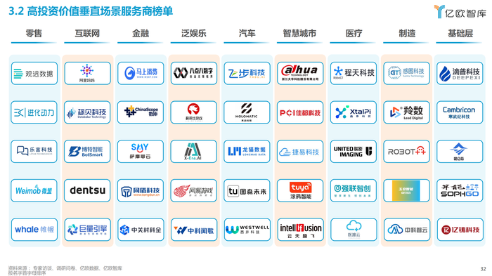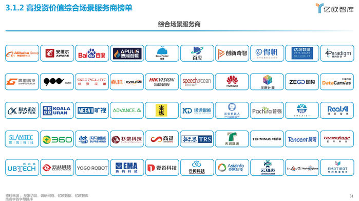亿欧对AI产业有深刻理解,具备多年研究经验,通过对标研究、内部调研与诊断等方式分析行业和企业痛点,重磅发布《中国AI商业落地投资价值报告》,以AI商业落地投资价值为研究对象,从“战略价值、降本增效和创收创利”三个层面衡量AI商业落地场景为企业带来的经济、成本和战略价值。以场景评价为基础,结合基于营收、业务增速、高价值场景覆盖数、场景落地能力等指标,评选出《高投资价值综合场景服务商榜单》和《高投资价值垂直场景服务商榜单》。此外,亿欧还对其中的代表性企业进行案例分析,供读者参考。由于调研时间和范围有限,以及受访企业的填答意愿不同,最终呈现的榜单难免有所遗漏,欢迎业界补充指正。