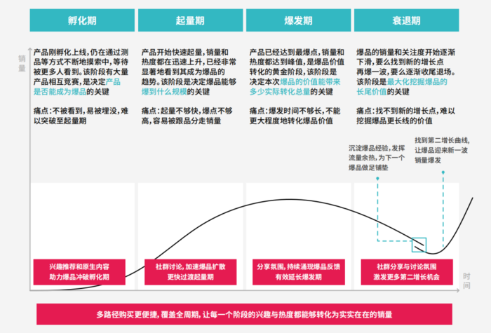 而细看爆品发展阶段,社群电商平台之所以是优选,也是因为其贯穿了爆品的全生命周期。《TikTok for Business 社群电商爆品营销白皮书》将爆品的生命周期拆解为四个阶段:孵化期、起量期、爆发期和衰退期,每个阶段社群电商的优势和能力都能发挥重要作用。